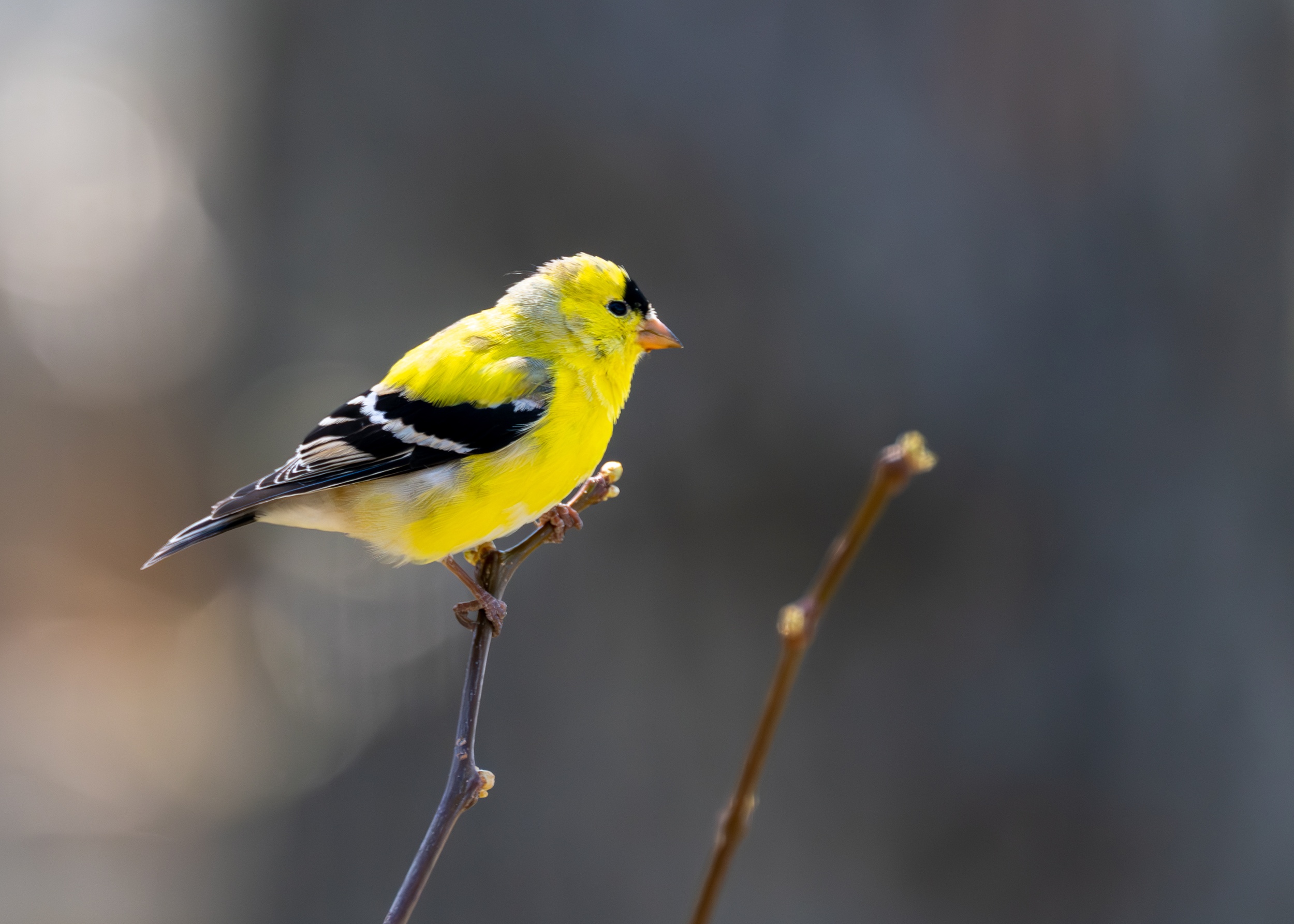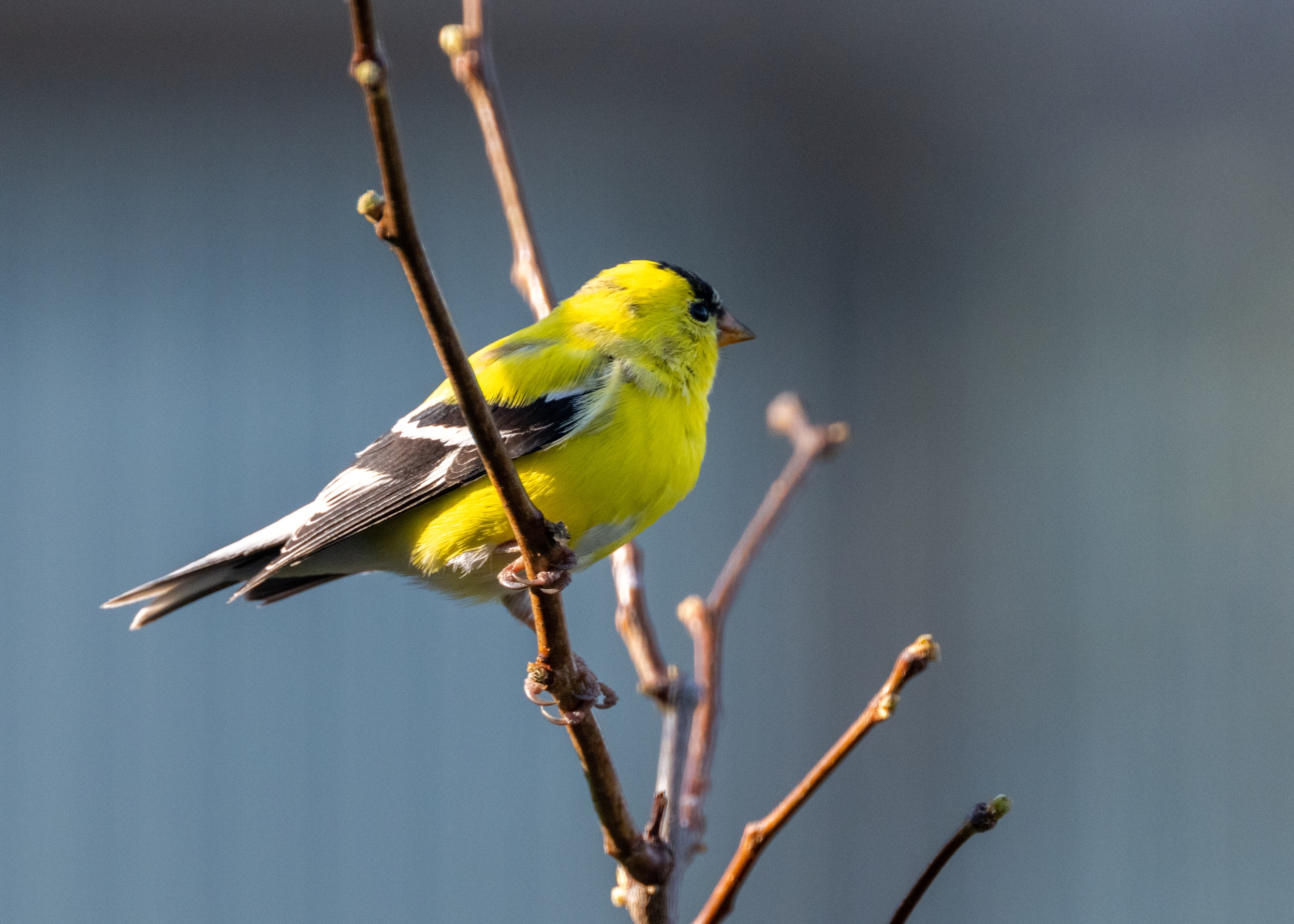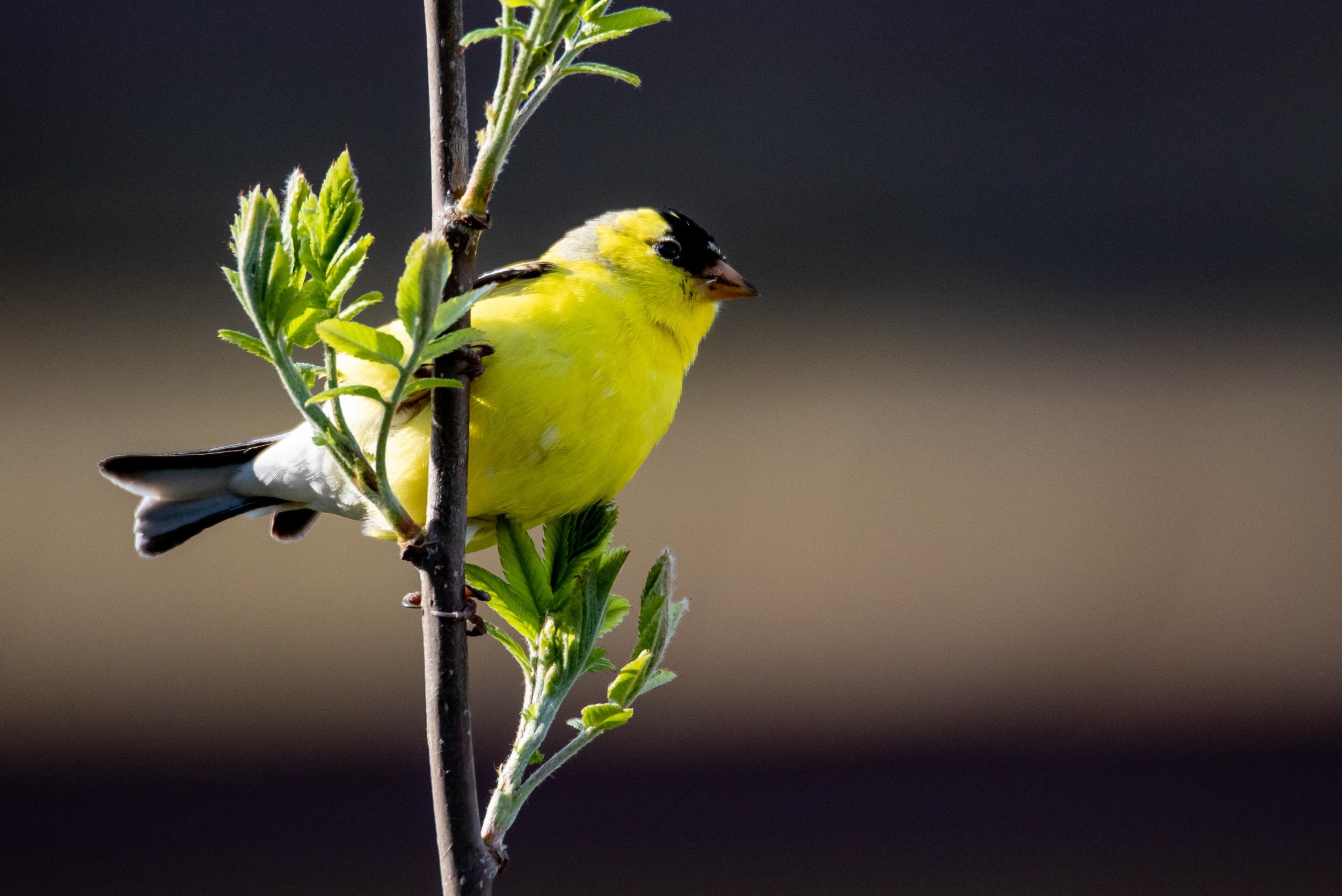 Perched beside a spray of new leaves, this male looks right at home in the shrubby edge habitat goldfinches favor around open water, fields, and yards. These birds are year-round Wisconsin residents, but spring is when the males become especially eye-catching and start turning every twig into a display perch.