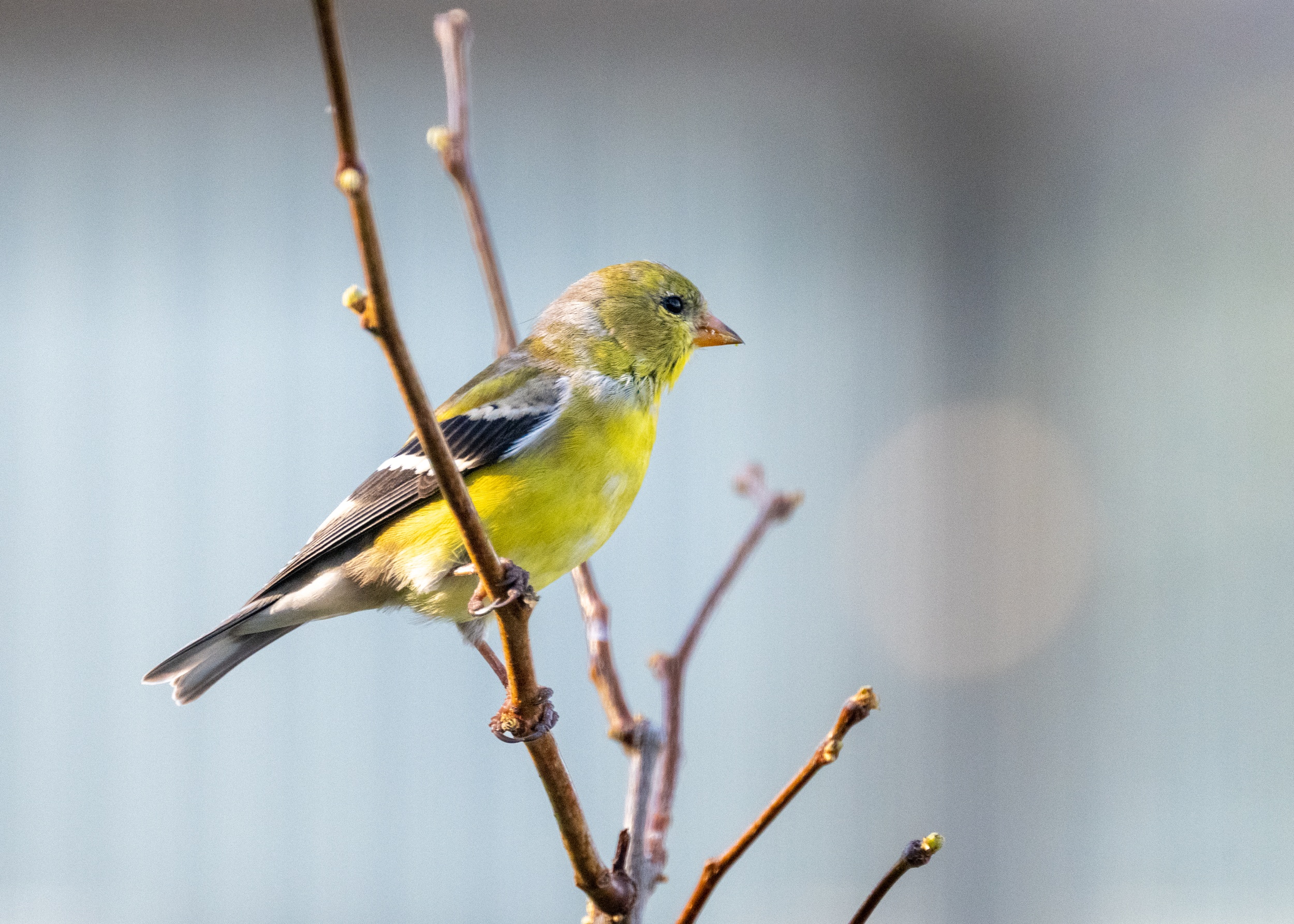 Not every goldfinch flashes the same high-voltage yellow. Birds with softer olive and yellow tones, like this one, can be females, younger males, or birds caught mid-molt, showing how variable American Goldfinches can look from season to season while still keeping the same compact shape and neat wing bars.