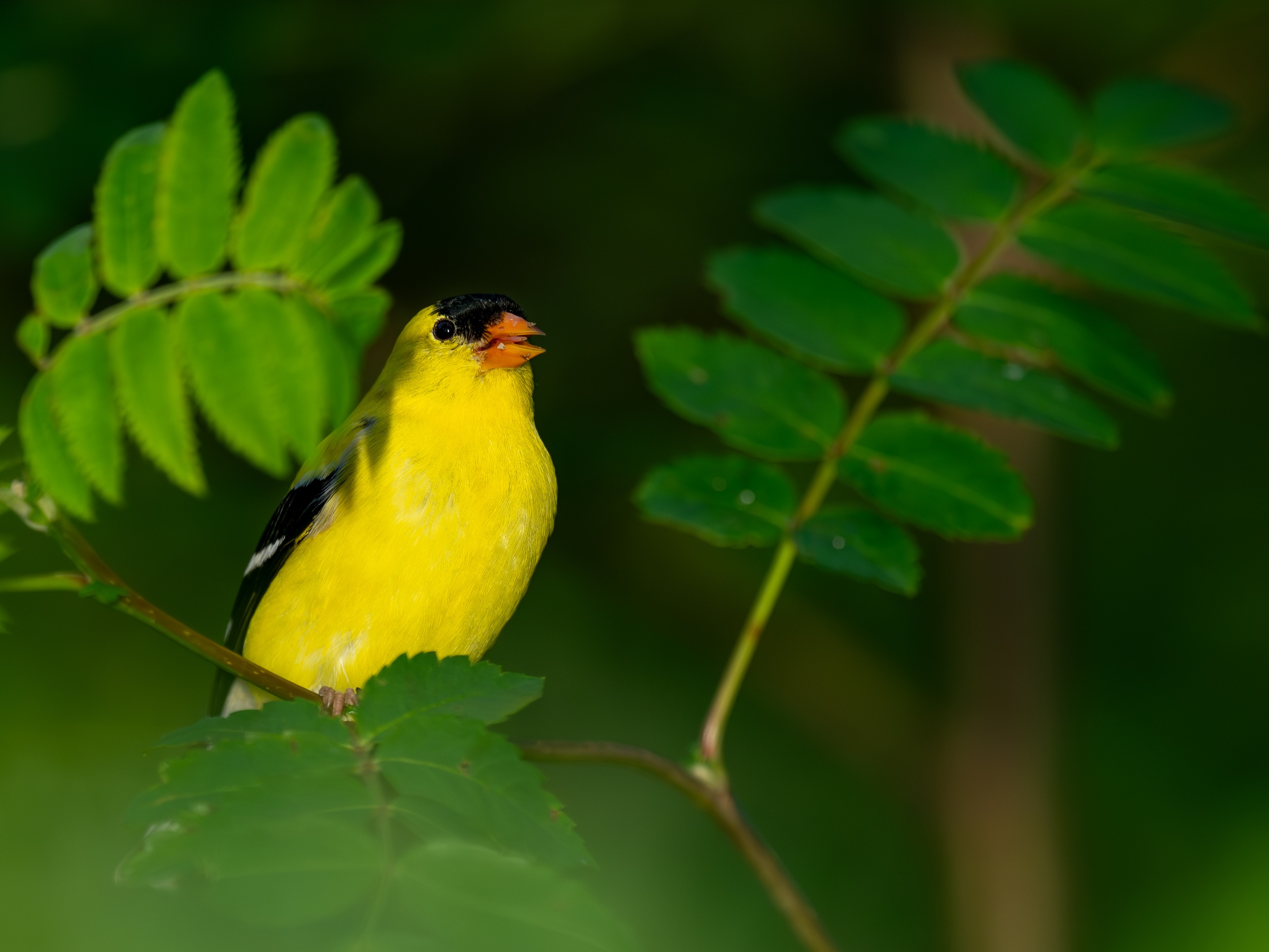 With bill open in fresh summer greenery, this goldfinch appears to be delivering the bright, tumbling song that carries so well across a quiet yard or lakeside path. American Goldfinches are among the latest nesters in the region, timing breeding to the peak availability of downy plant fibers and ripening seeds.