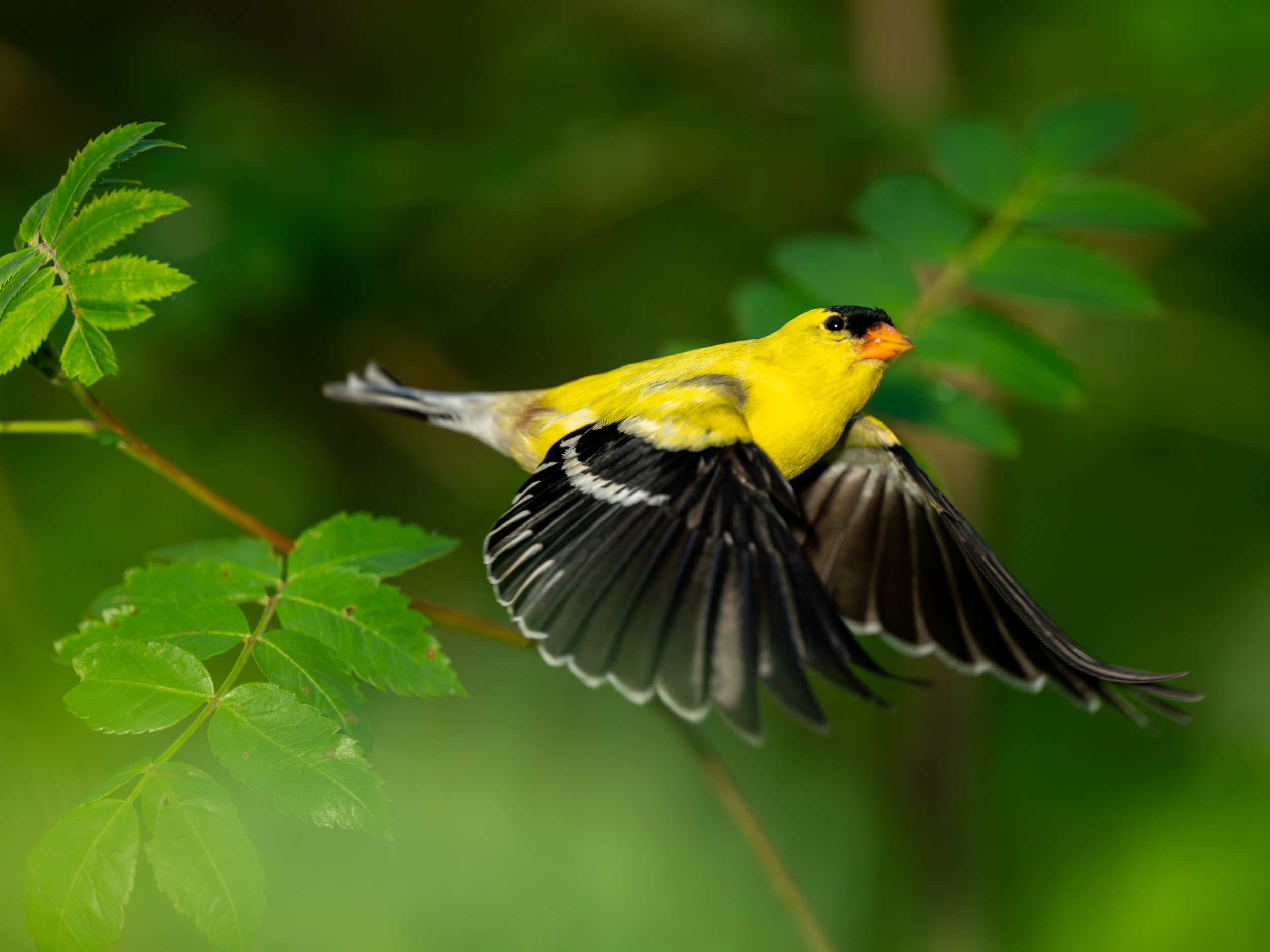 Caught mid-flight, the goldfinch shows the strong contrast that makes the species so easy to recognize on the wing: bright body, dark wings, and sharp white markings. Their flight often rises and falls in a springy, roller-coaster pattern, with brief bursts of flapping followed by quick glides.